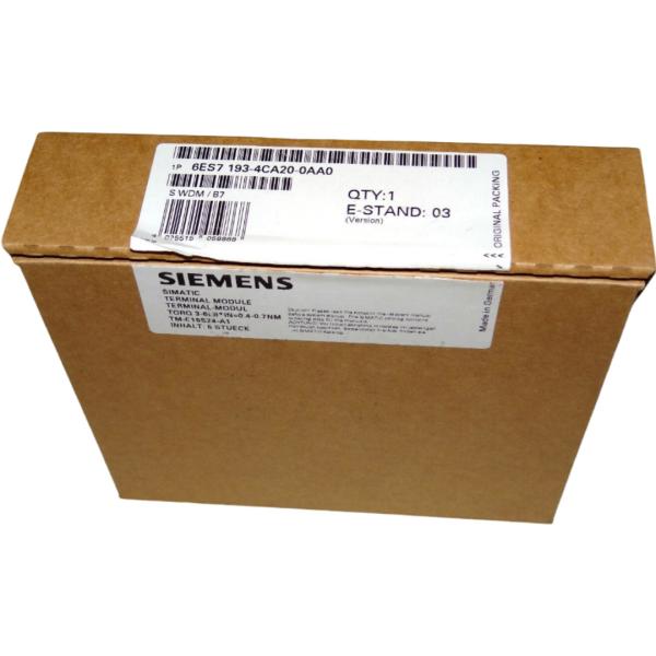 The **Siemens 6ES7193-4CA20-0AA0** is a **SIMATIC DP Terminal Module** designed for **ET 200S** systems. This module includes **5 Terminal Modules TM-E15S24-A1** for electronic modules with a width of 15 mm. It features **screw terminals** and **2x4 terminal connections** with terminal access to AUX1.