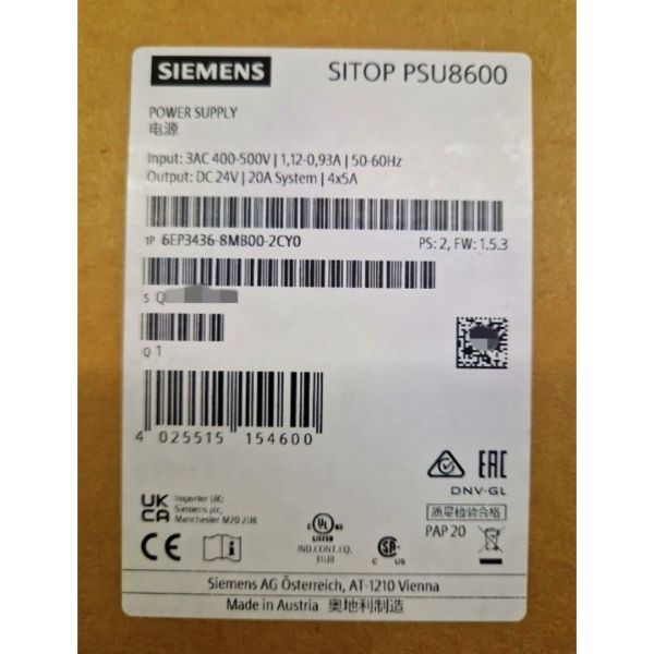 | Product Description | SITOP PSU8600 3AC 20 A/4x5 A PN stabilized power supply input: 400-500 V 3 AC output: 24 V DC/20 A/4x 5 A with PN/IE connection web server integrated OPC UA server integrated |