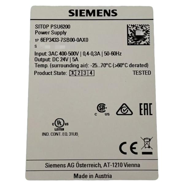 SIEMENS 6EP3433-7SB00-0AX0 SITOP PSU6200 24 V/5 A STABILIZED POWER SUPPLY INPUT: 400 - 500 V AC OUTPUT: 24 V DC/5 A Images |